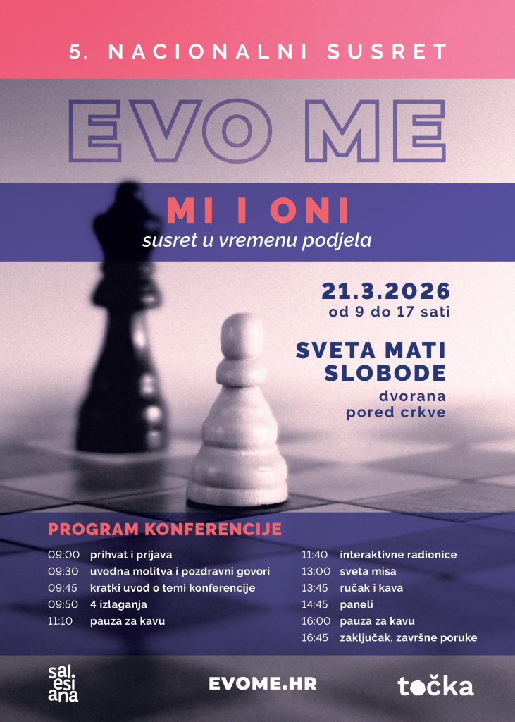 S radošću vas pozivamo na 5. nacionalni susret projekta Evo me, koji će se održati u subotu, 21. ožujka 2026., kod salezijanaca na Jarunu (dvorana pored Crkve Svete Mati Slobode, Ul. don Petra Šimića 1, Zagreb).